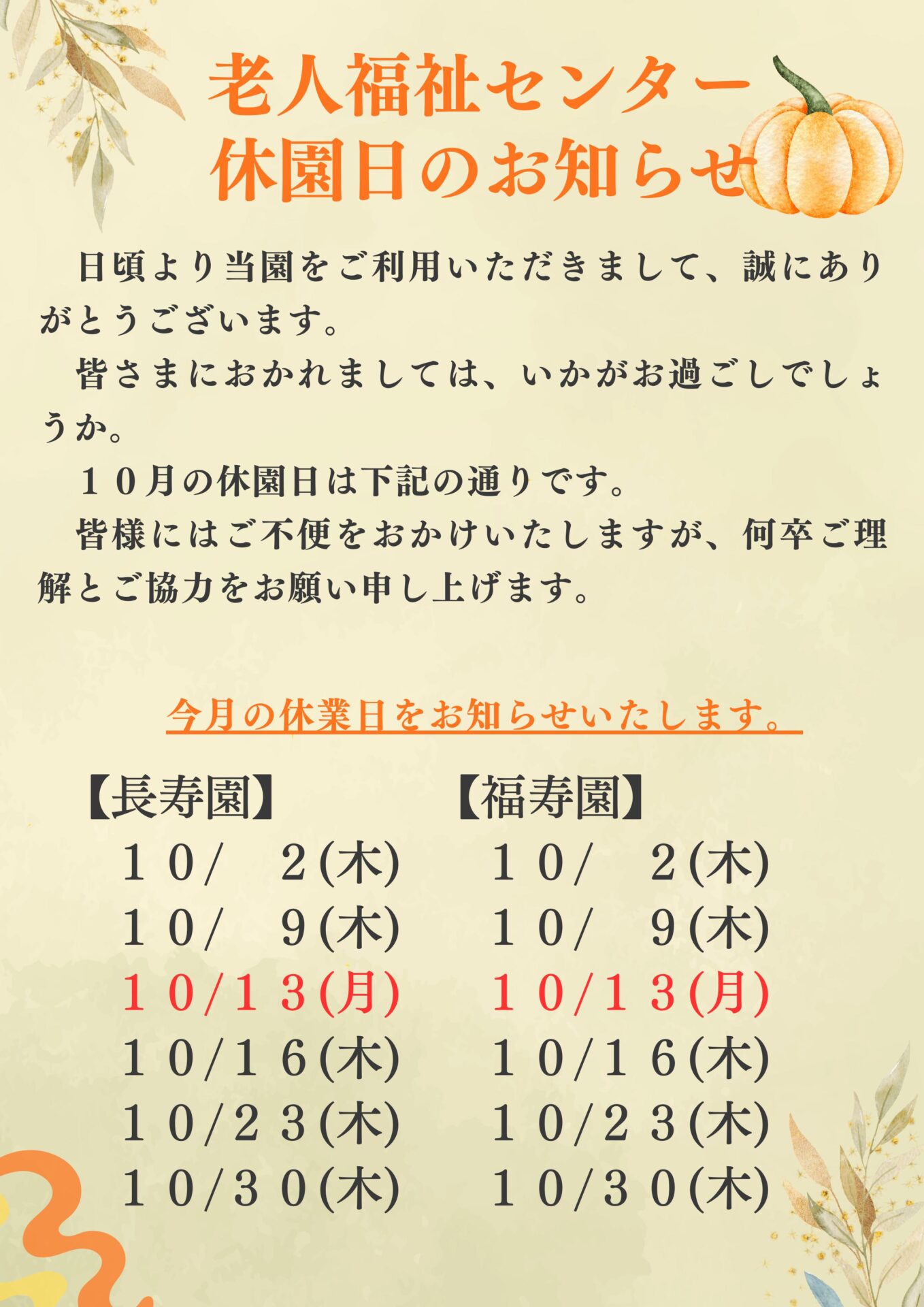 老人福祉センター長寿園・福寿園10月休園日のお知らせ