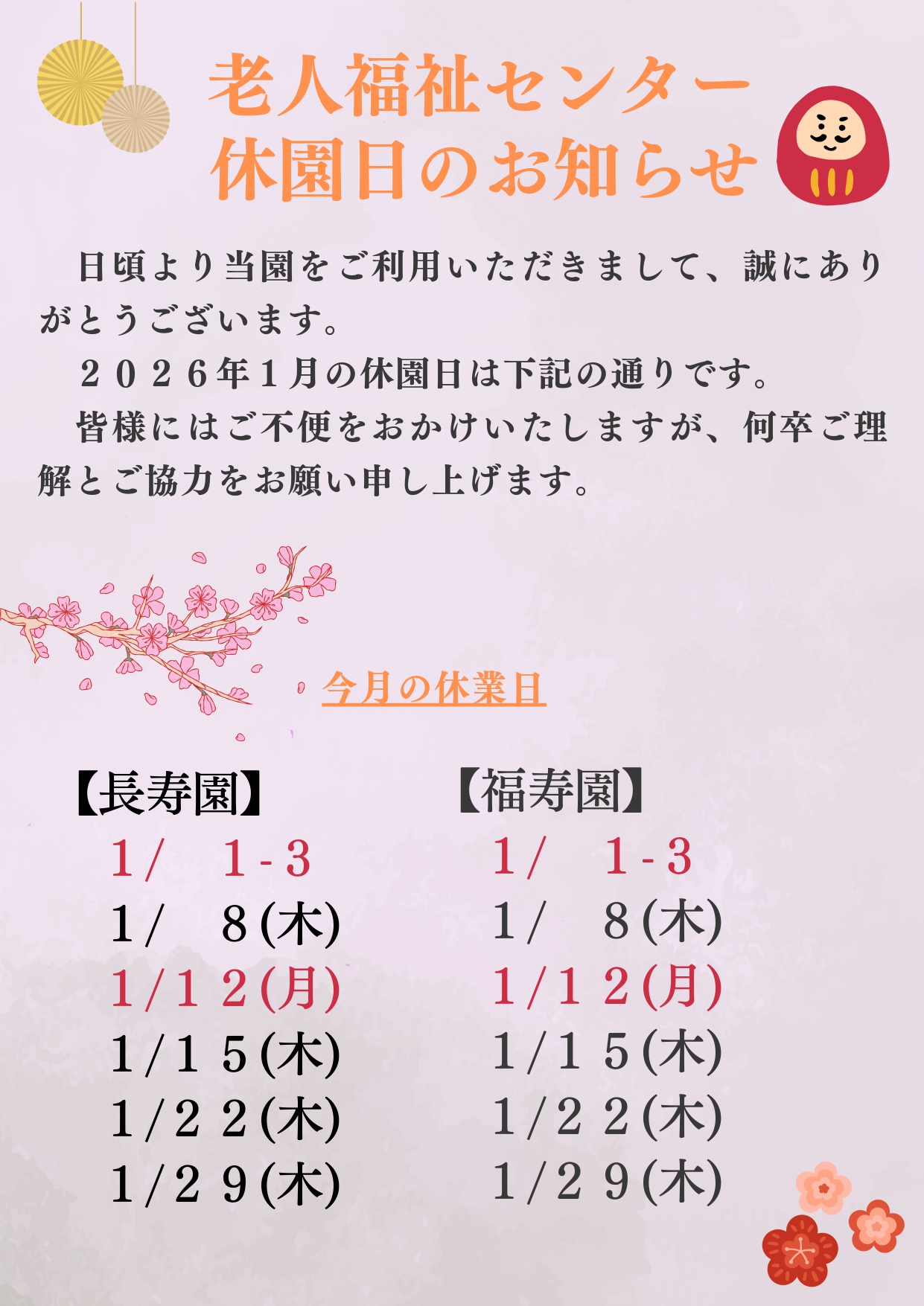 老人福祉センター長寿園・福寿園1月休園日のお知らせ