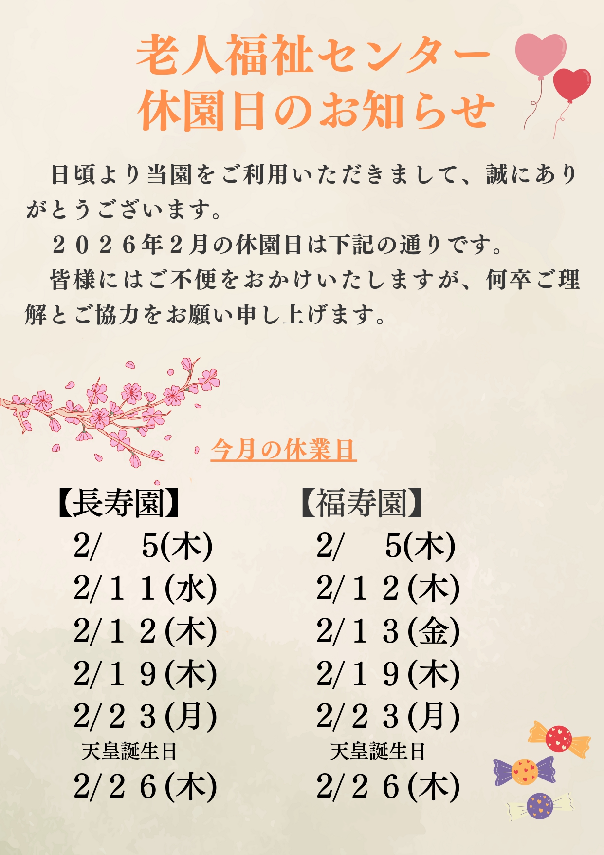 老人福祉センター長寿園・福寿園2月休園日のお知らせ