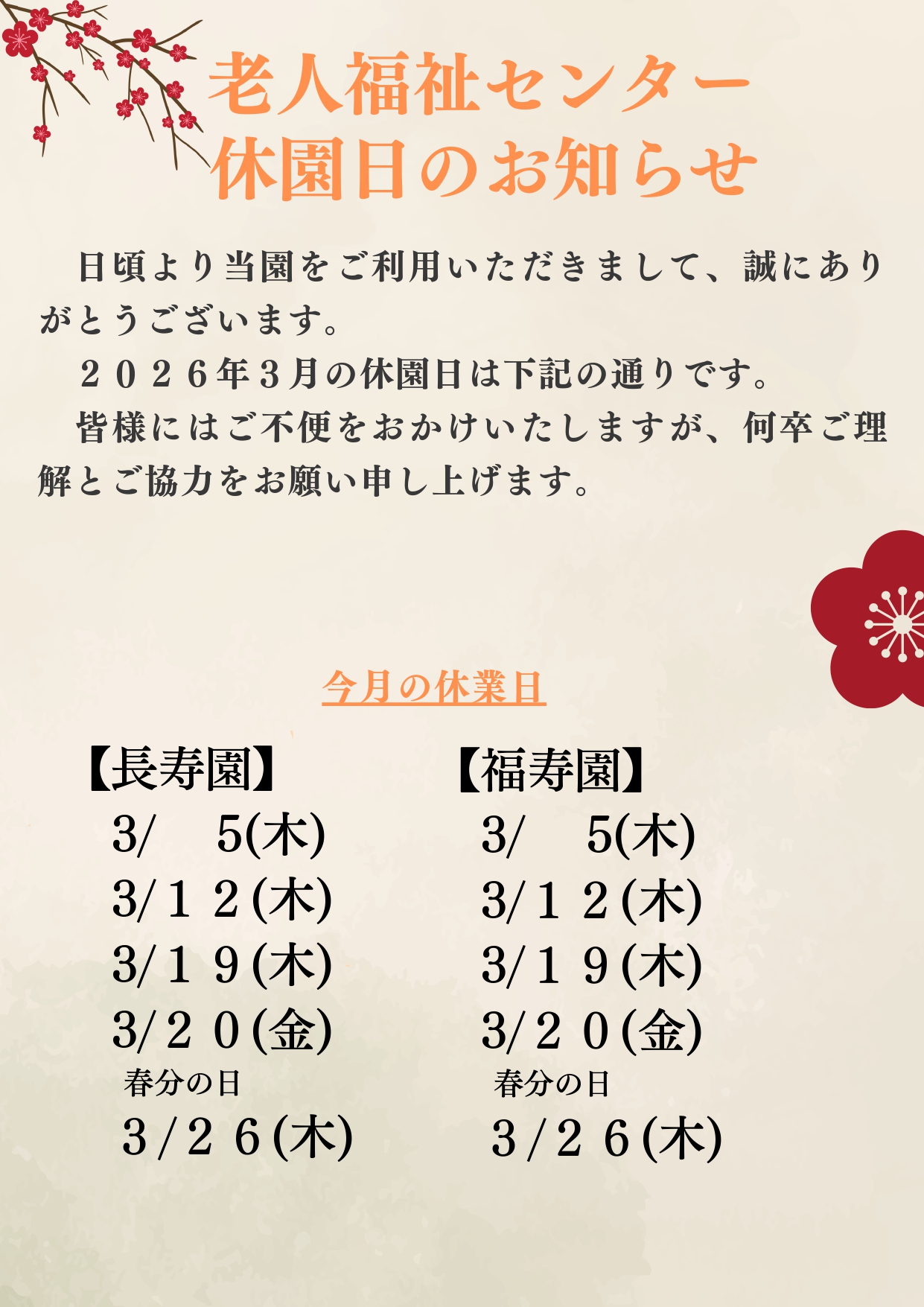 老人福祉センター長寿園・福寿園3月休園日のお知らせ🌸