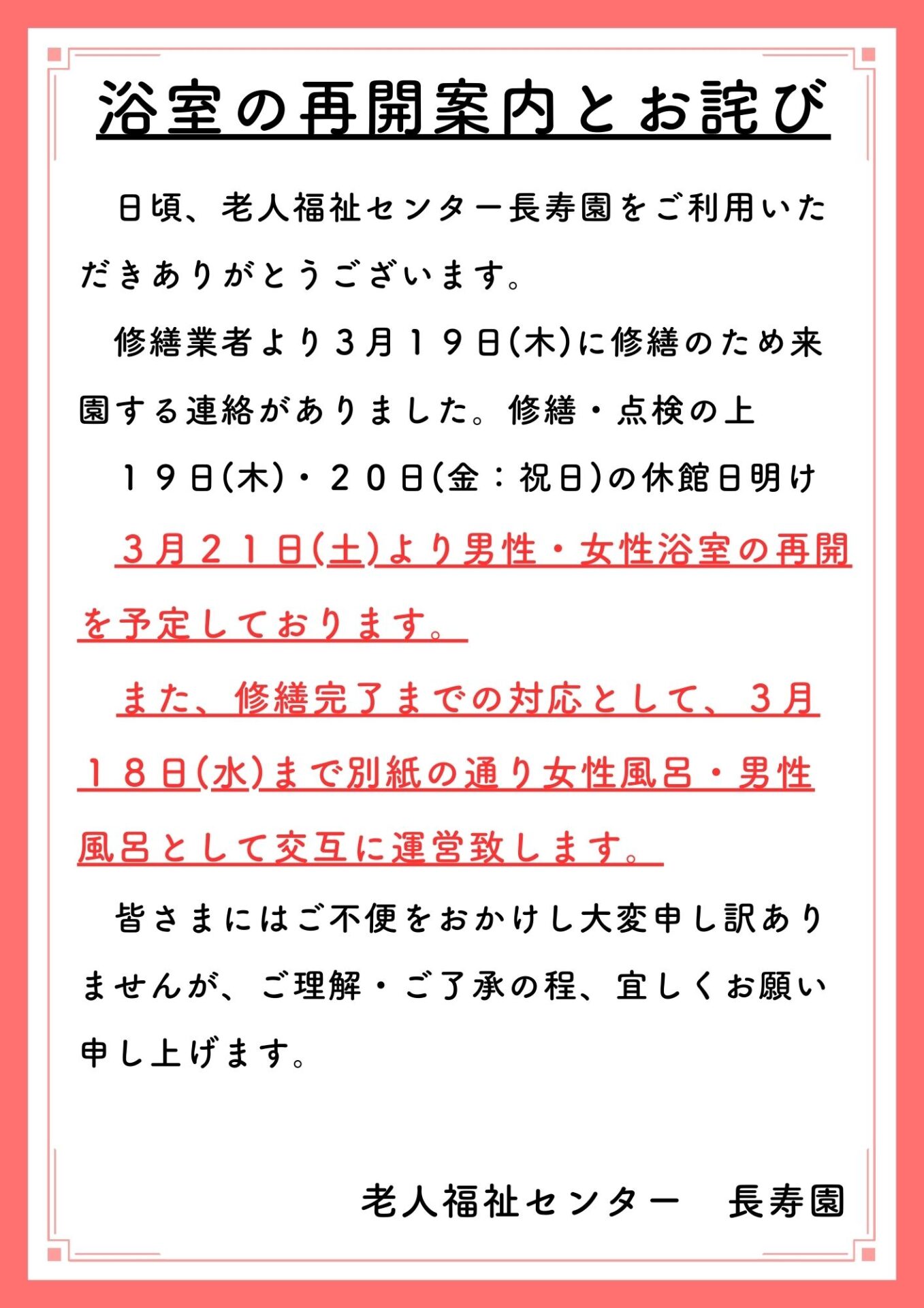 (長寿園)3/21(土)より 男性浴室・女性浴室利用再開とお詫びのお知らせ