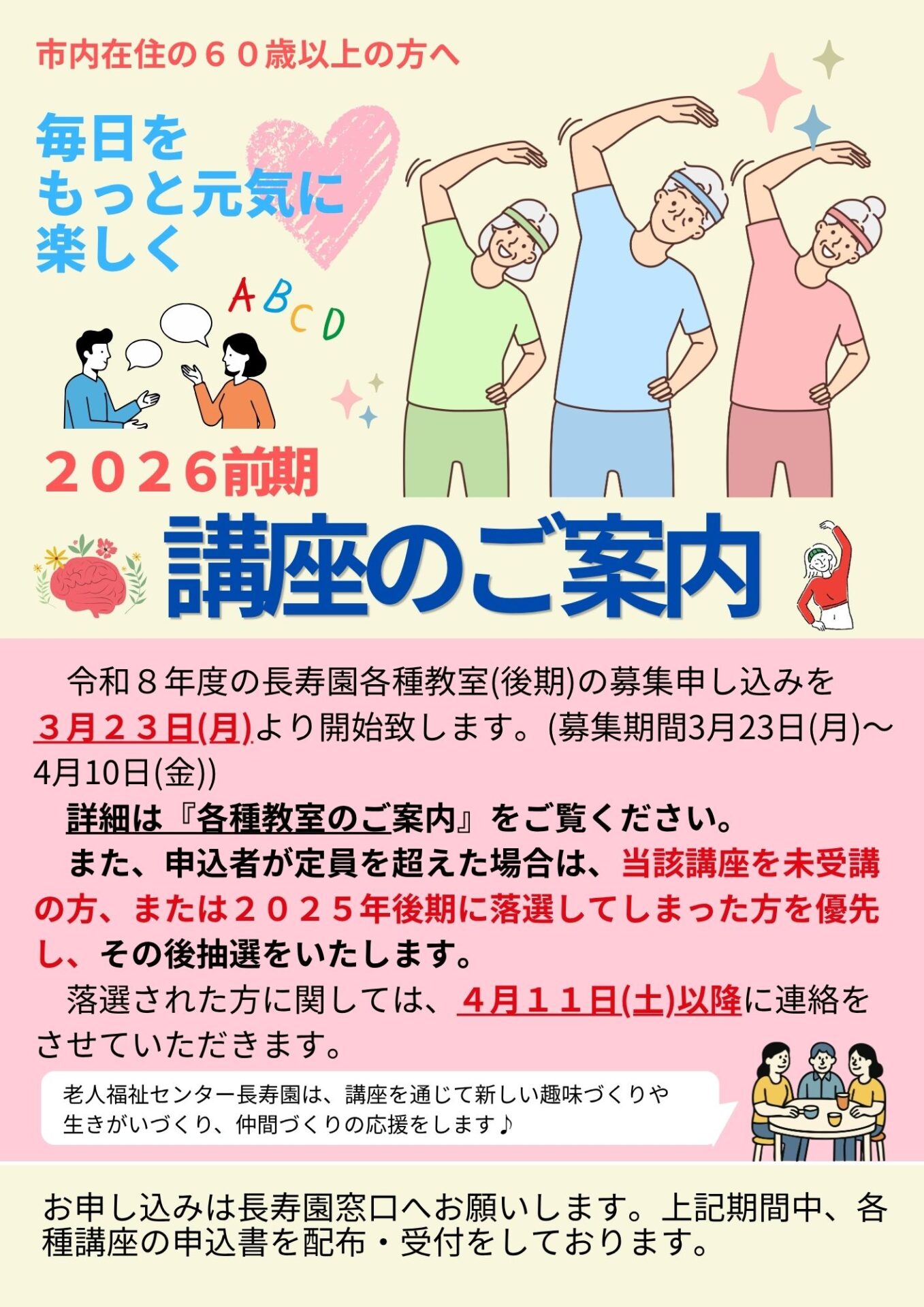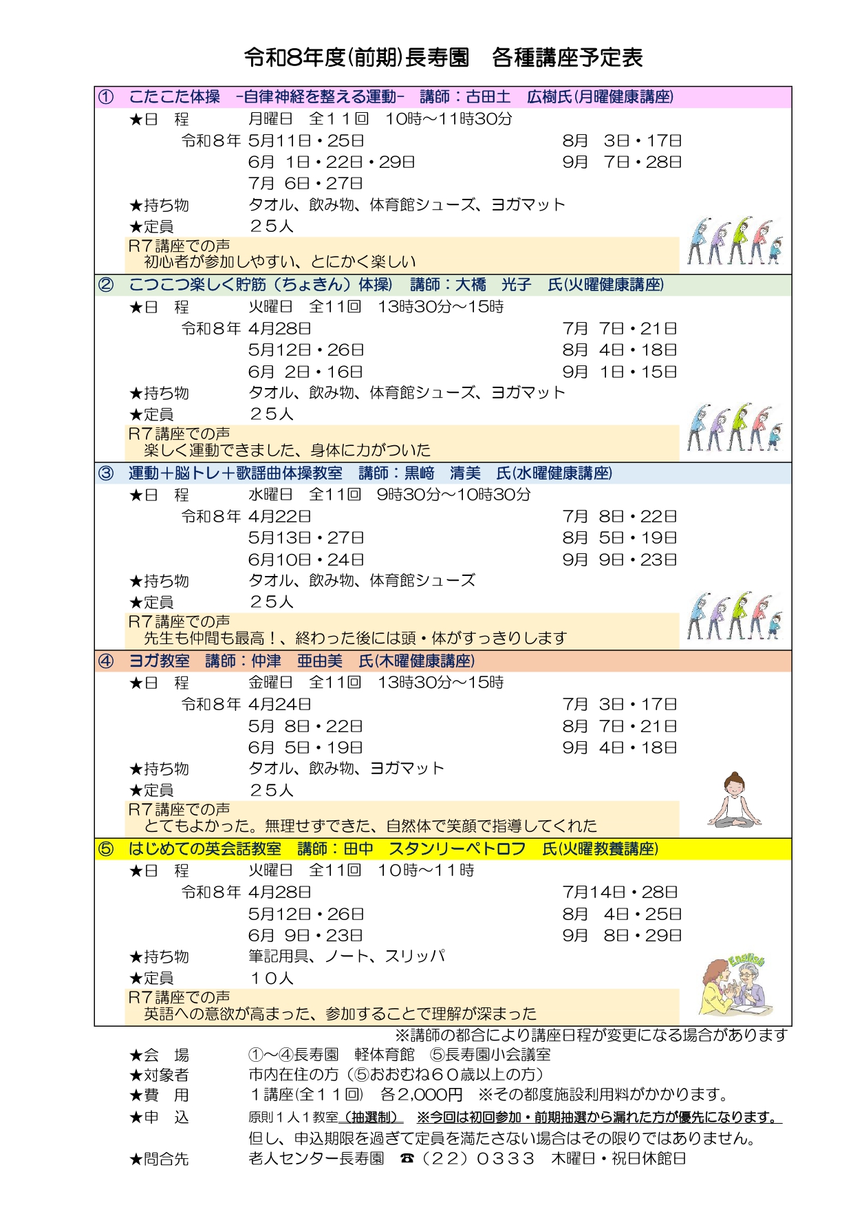 長寿園では生きがい作り、仲間づくりを目的に各種講座を実施しています。どの講座も初心者の方々が安心してご参加できる内容となっています。