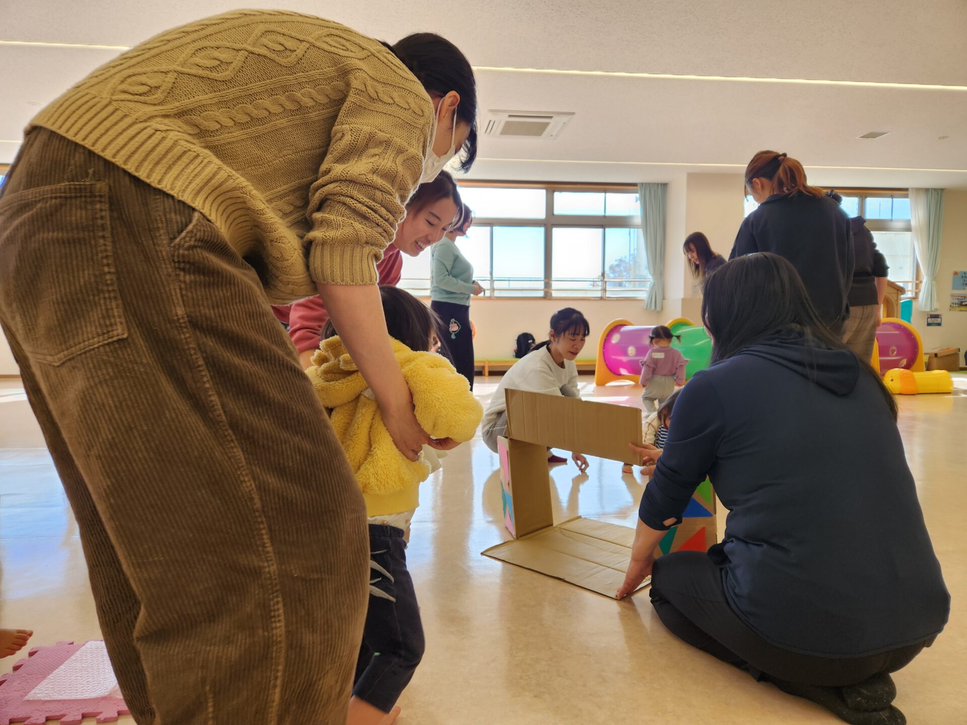 西方地区主任児童委員の臼井さんによる絵本の読み聞かせとリトミックを行いました。リトミックでは音楽に合わせてお子さんと一緒に体を動かしたり、新聞紙をビリビリ破いたり丸めたりと楽しい時間を過ごしました。