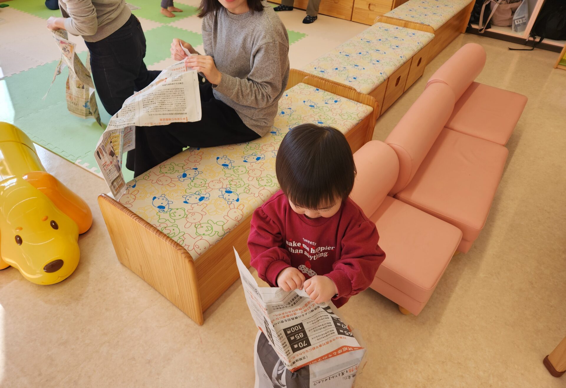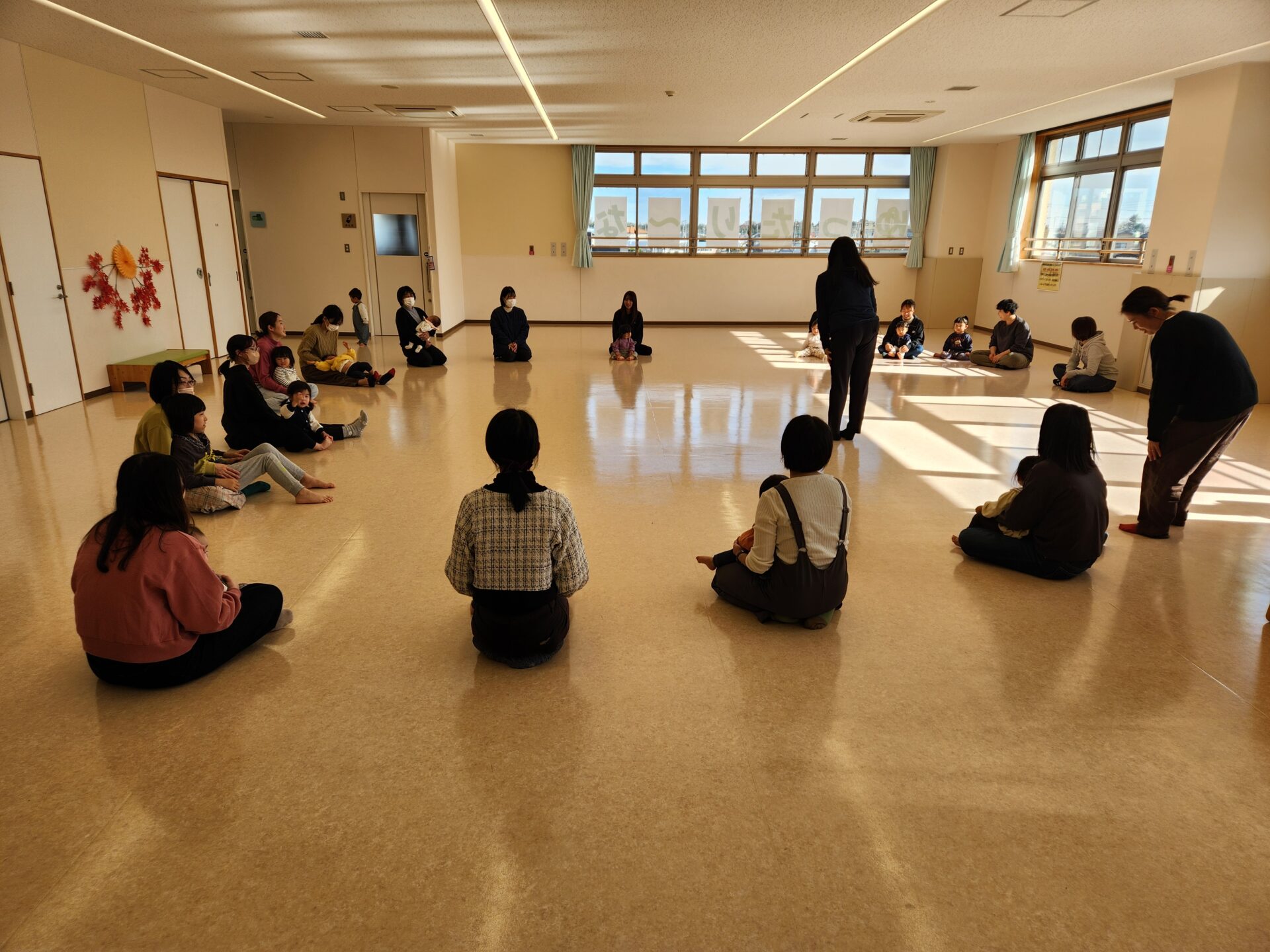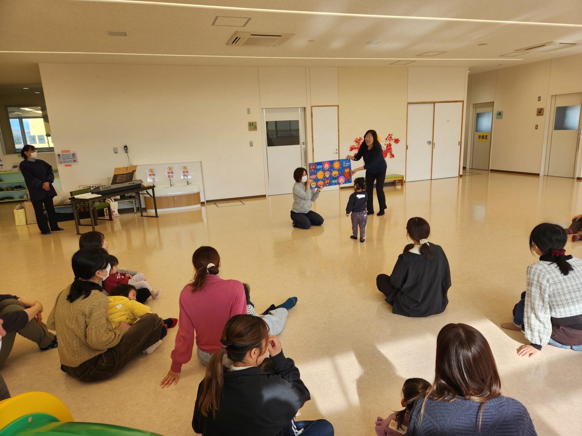 西方地区主任児童委員の臼井さんによる絵本の読み聞かせとリトミックを行いました。リトミックでは音楽に合わせてお子さんと一緒に体を動かしたり、新聞紙をビリビリ破いたり丸めたりと楽しい時間を過ごしました。