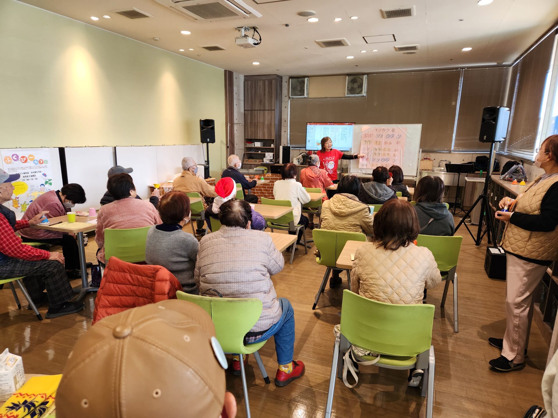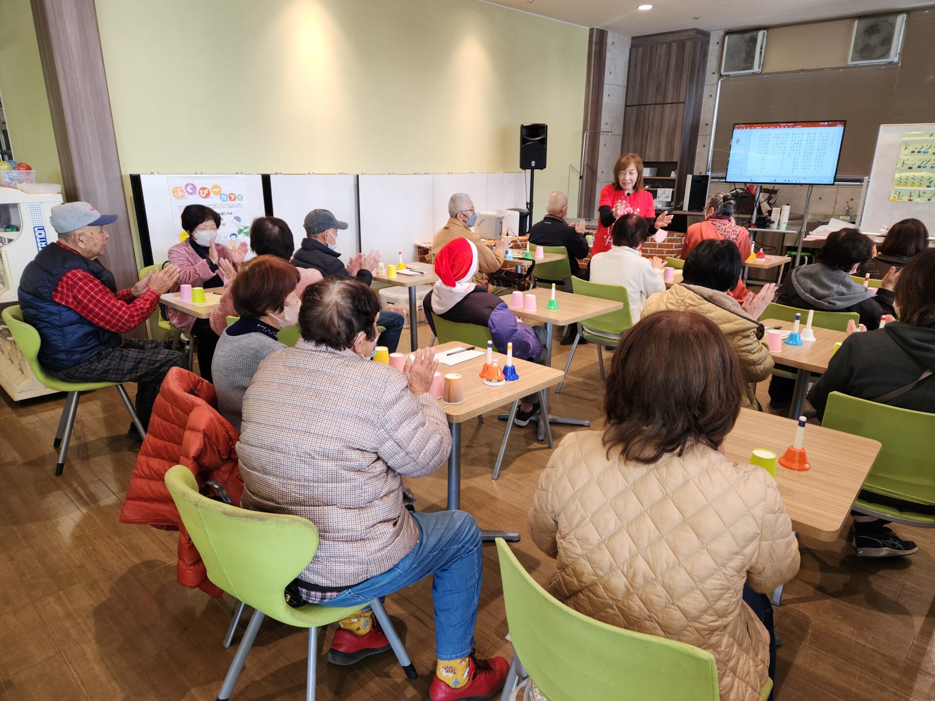 シナプソロジーでは、参加者も一緒にハンドベルを使ってクリスマスソングの演奏をしました。みんなで協力しあいながらの演奏は脳トレにもなり、楽しい時間を過ごしました。
