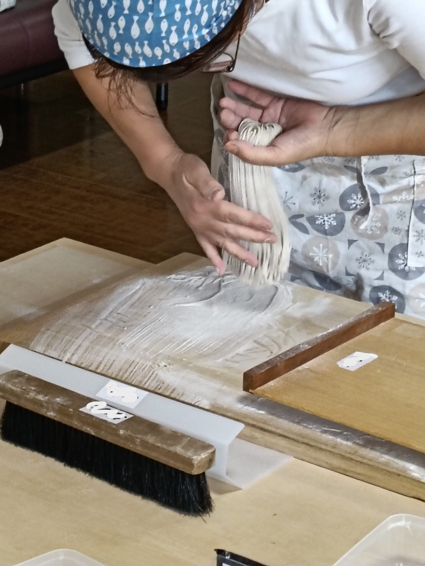 今回もセンターご利用のみなさんの目の前でそば打ちを実演してくださり、麺ができあがるまでの間真剣に見入っていました。切り分けた麺は驚くほどみな均等の細さで、見ていたみなさんはその美しさにとても感心していました。